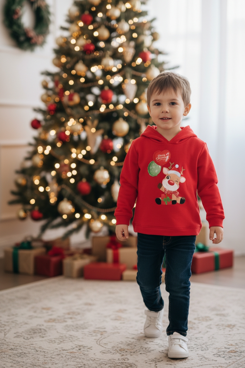 Bluza dla dzieci w rozm. 98- 110 ze świątecznym nadrukiem w kolorze soczystej czerwieni. Dzięki połączeniu klasycznego kroju z nowoczesnym wzornictwem, ta bluza przyciąga uwagę swoim wyjątkowym designem. Wykonana z wysokiej jakości dzianiny dresowej z dodatkiem elastanu, zapewnia nie tylko wygodę, ale także trwałość i odporność na odkształcenia. Elastyczny materiał doskonale dopasowuje się do ruchów dziecka, umożliwiając swobodne bieganie, skakanie i zabawę, jednocześnie zapewniając ciepło i komfort nawet podczas aktywnych zajęć na świeżym powietrzu. Dzięki swojemu wyjątkowemu nadrukowi bluza stanowi doskonałe uzupełnienie codziennej garderoby każdego dziecka i z pewnością posłuży dłużej niż tylko w okresie świątecznym. Pasuje zarówno do jeansów, jak i do spodni sportowych, nadając każdemu strojowi charakteru i indywidualnego stylu. Z pewnością stanie się ulubionym elementem garderoby.
