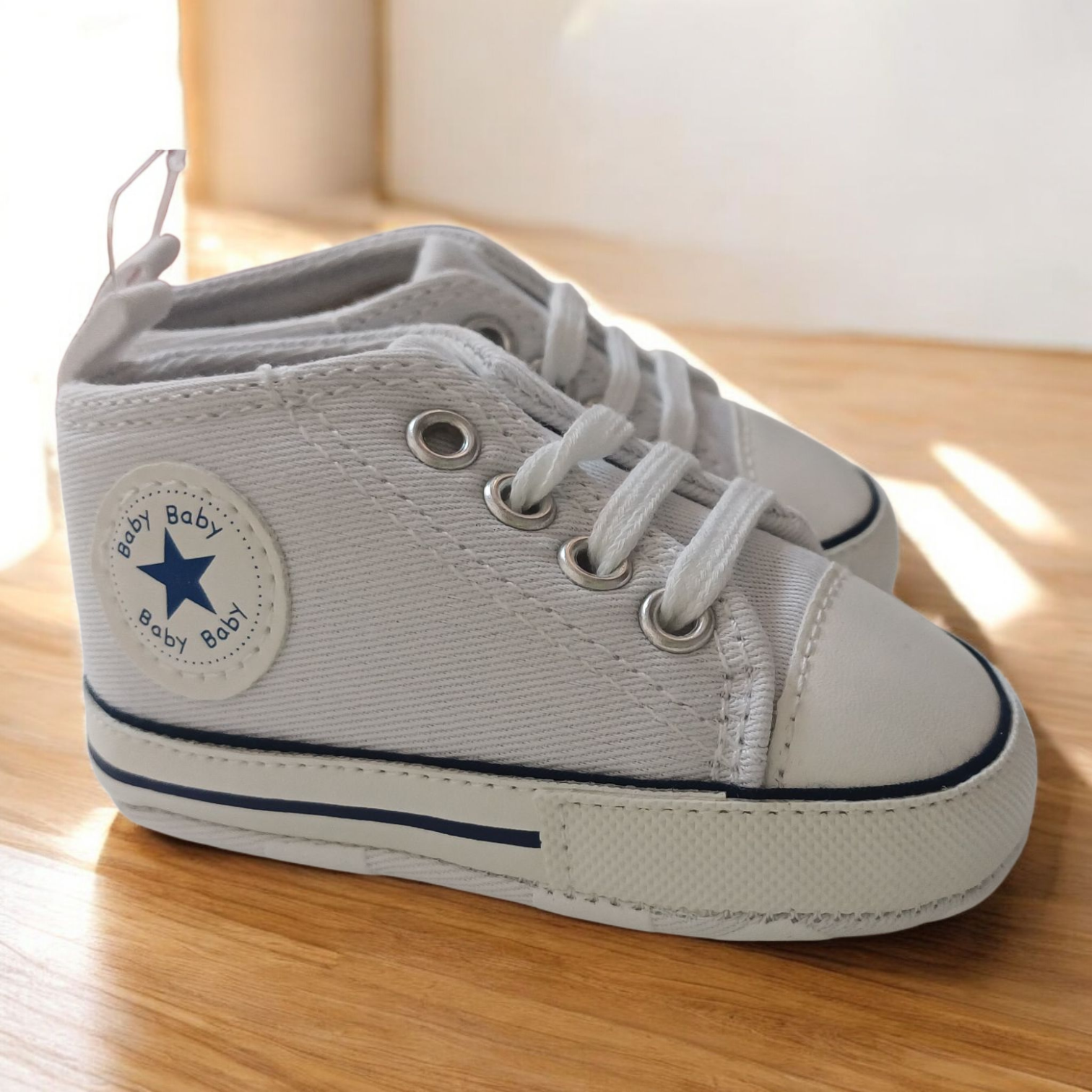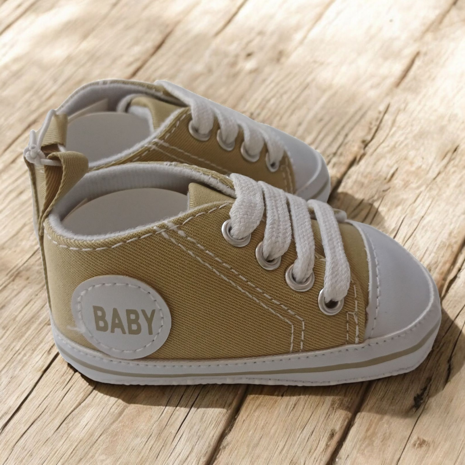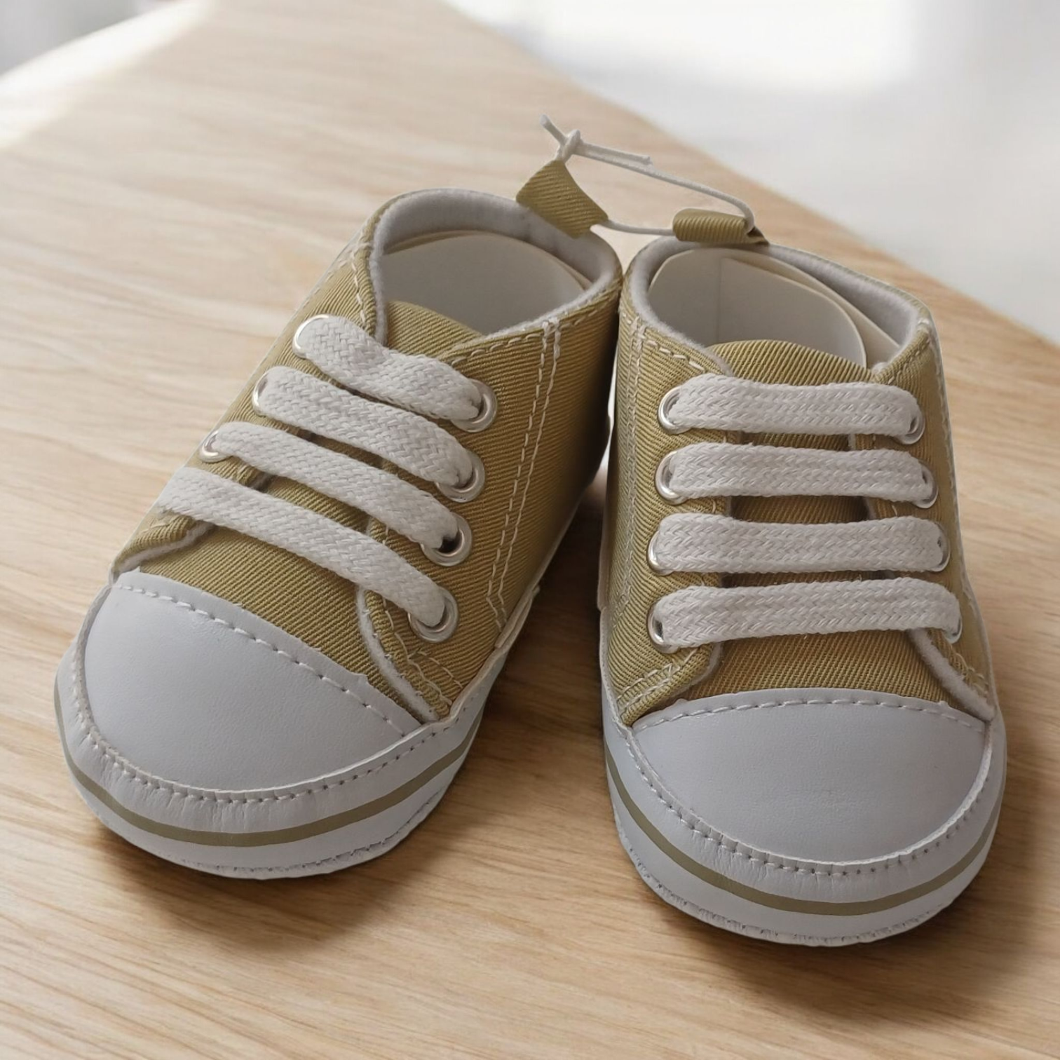 Urocze buciki- niechodki. Trampki niemowlęce w dwóch kolorach: khaki i biały. Buciki w rozm. 0- 6 m-cy oraz 6-12 m-cy.