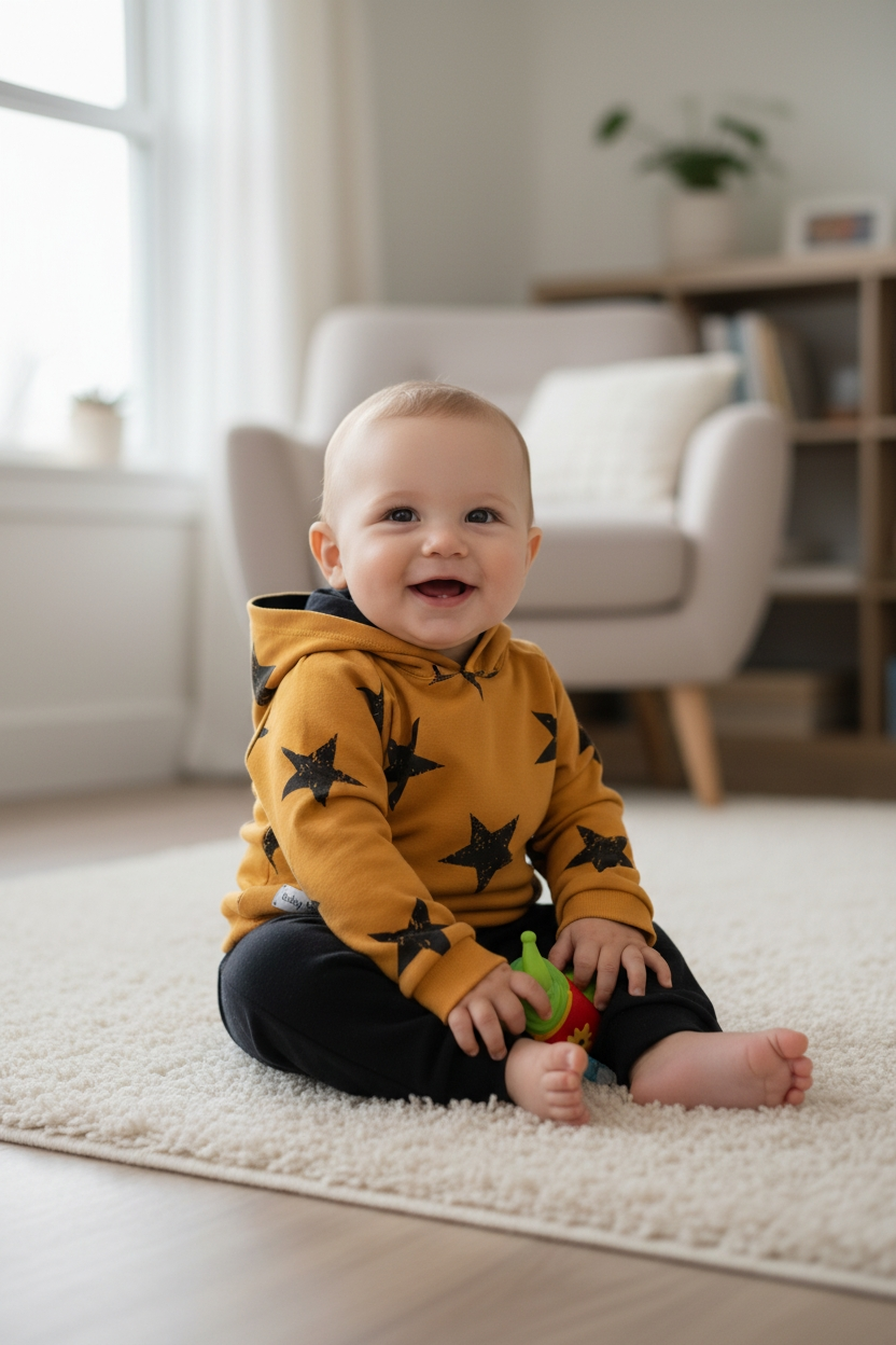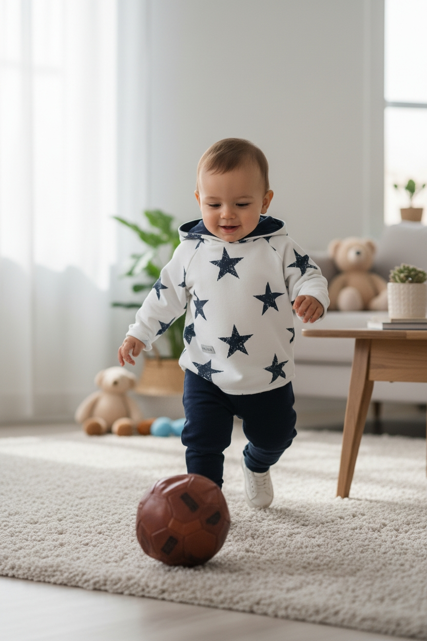 Poszukujesz wyjątkowego kompletu dla swojego maluszka? Komplet niemowlęcy Stars to doskonały wybór zarówno dla chłopców, jak i dziewczynek. Wykonany z najwyższej jakości dzianiny dresowej z domieszką elastanu, ten zestaw nie tylko zapewni komfort, ale także świetny wygląd. Składa się z asymetrycznej bluzy z kapturem ozdobionym nadrukiem w gwiazdy oraz czarnych spodni typu baggy, co sprawia, że maluch będzie wyglądał stylowo i oryginalnie.