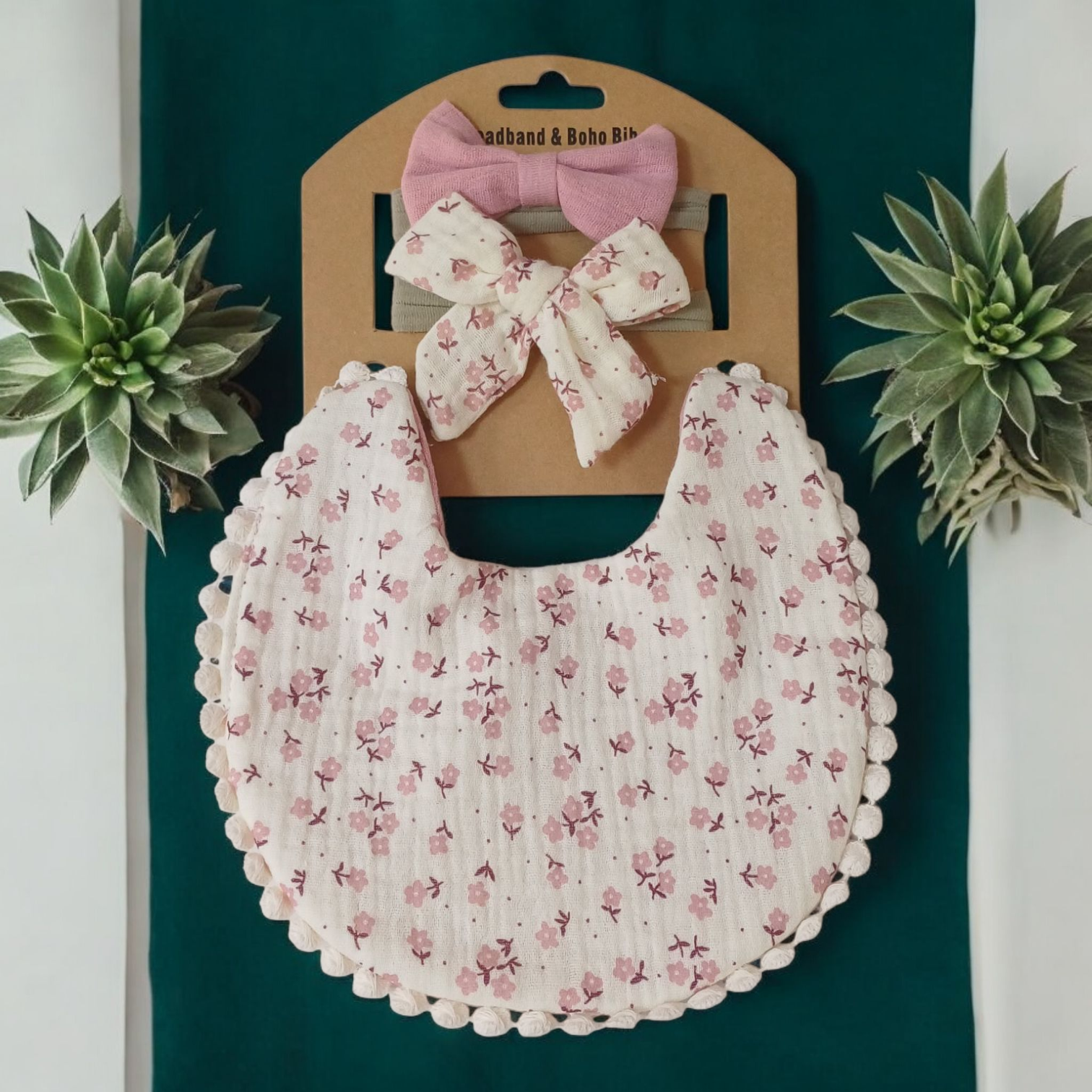 Piękny śliniaczek, wykonanych z muślinu- dwustronny. W zestawie 2 opaski- kokardki bezuciskowe.