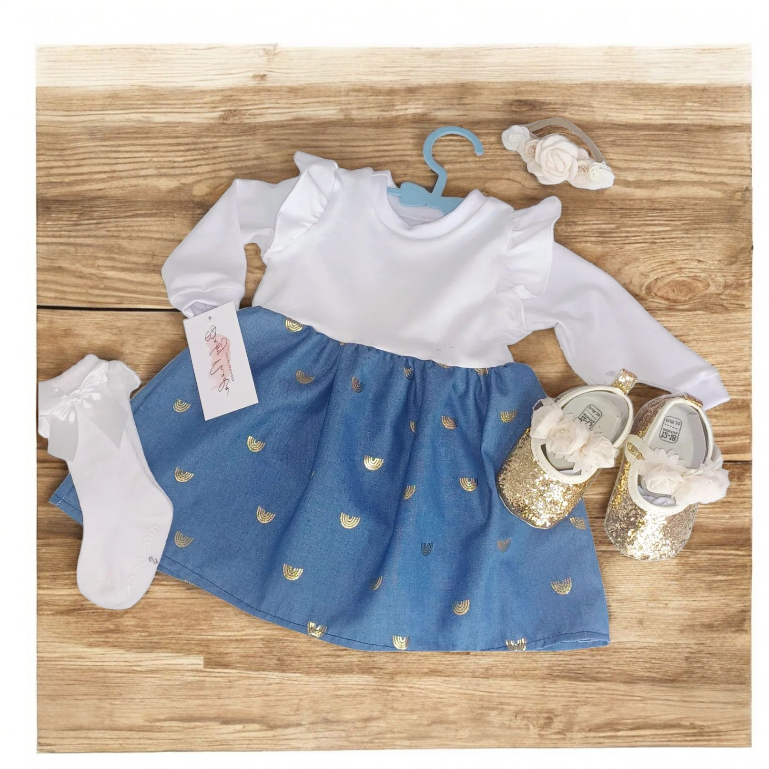 Cudowna sukienka z brokatowym nadrukiem w tęczę. Idealna na wiosenne spacery. Góra sukienki uszyta z białego jerseyu z domieszką elastanu, co zapewnia rozciagliwość i ułatwia użytkowanie. Dół sukienki to cieniutki jeans z przepięknym nadrukiem.